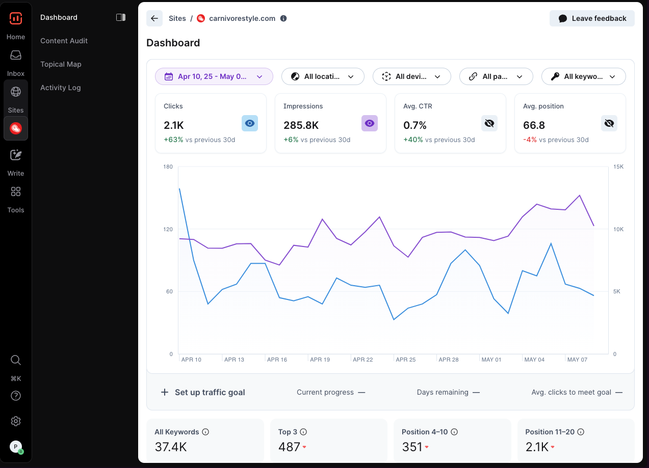 Fresh, up-to-date content performs better in Google and gets discovered by LLMs. Sites gives you weekly updates on what to write, refresh and prioritize next, so you’re never guessing where to spend your time (or budget).