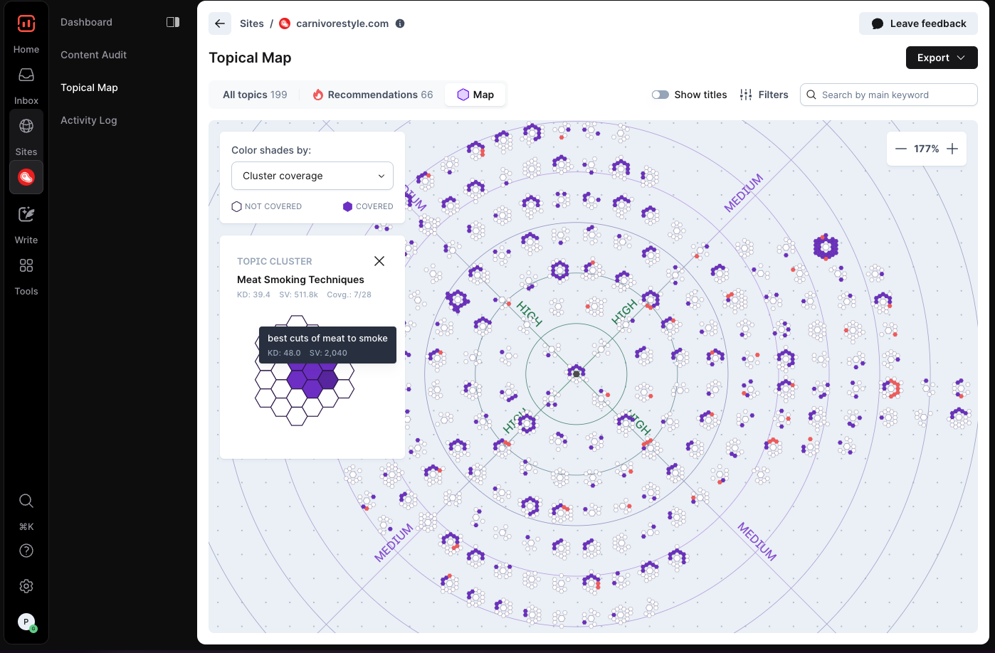 Topical Map doesn't just give you new article and keyword ideas; it helps you build topical authority and shows you your content gaps.